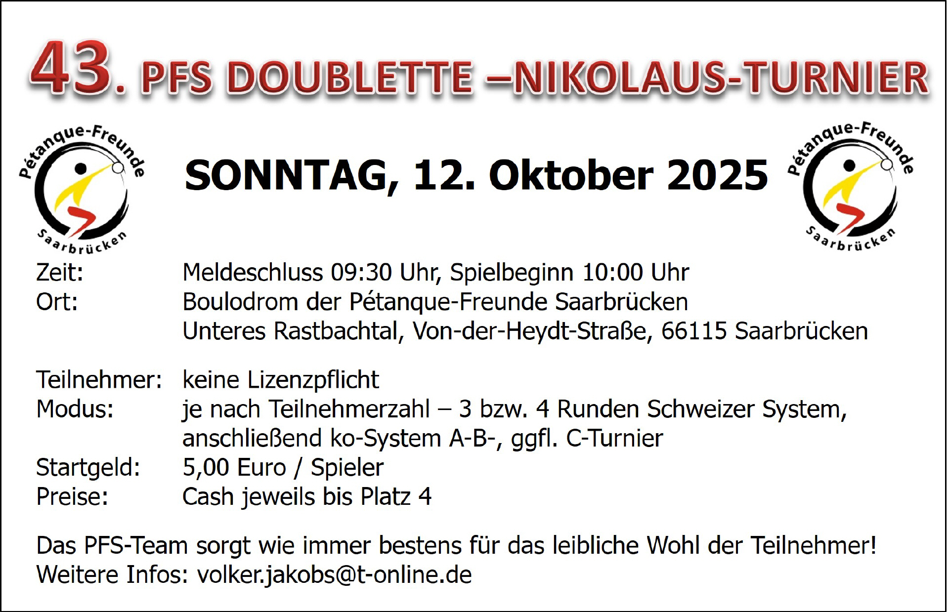In Kooperation mit dem Saarländischen Boule-Verband fand auf der Boule-Anlage der Pétanque-Freunde Saarbrücken in der Von-der-Heydt-Straße, 66115 Saarbrücken am Samstag, 28. Juni 2025 unter der Schirmherrschaft von Oberbürgermeister Uwe Conradt ein Doublette-Turnier für „jedermann“, insbesondere für Anfänger statt. Vertreten wurde der Oberbürgermeister anlässlich dieser Veranstaltung von Bezirksbürgermeister Hans-Jürgen Altes. Kugeln wurden gestellt; die Teilnahme war kostenlos. Lizenzspieler waren zu diesem Turnier nicht zugelassen. Bei strahlendem Wetter wurden 4 frei ausgeloste Runden gespielt. Jeder Teilnehmer erhielt bei der anschließenden Siegerehrung eine Medaille.